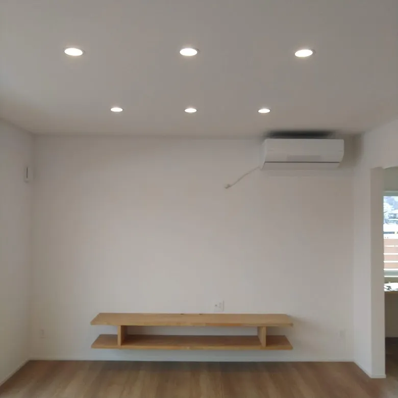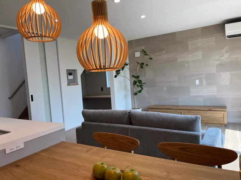 取付け金具が見えないテレビ台が特徴のリビング。