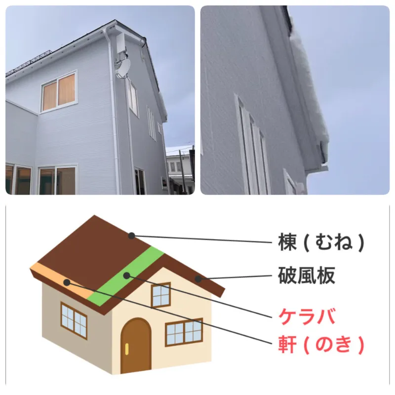 雪庇は必ずしも軒先側へ出るわけではなく、ケラバ側にもでます。
