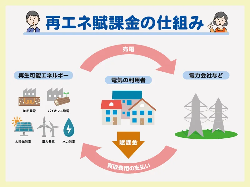 簡単にいうと、再生エネルギー(太陽光・風力など)を普及させるための費用です。日本では、固定価格買取制度(FIT)という仕組みがあり、電力会社が再エネで発電された電力を一定価格で買い取っています。その買取にかかる費用を、私たち電気利用者が、使用電力に乗じて少しずつ負担しているのが再エネ賦課金です。