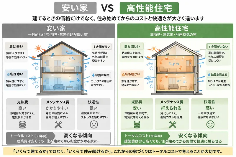 家づくりで大切なのは建てる時の価格だけではありません。建築費、光熱費、メンテナンス費、将来のリフォーム費。これらをすべて含めたトータルコストで考えることが重要です。