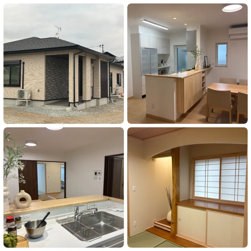 今回のお住まいは、ダブル断熱・トリプルガラスサッシ採用で夏も冬も快適な高性能住宅で、38坪・4LDKの完全バリアフリーの平屋です。全体にゆとり空間があり、また、各所にお施主様のこだわりが満載の一邸。実際に「こんな家に住みたい」「クロスやカーテンがおしゃれ」「坪数以上に広く感じる」といったお声を多くいただきました。