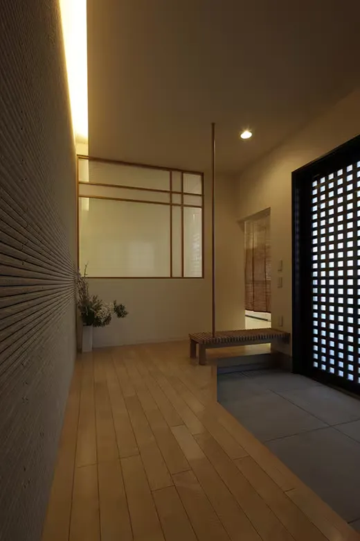 玄関にも美しい緊張感が漂う。正面の窓から真っ直ぐに視界が抜け、イロハモミジが四季折々の美しさで出迎えてくれる。