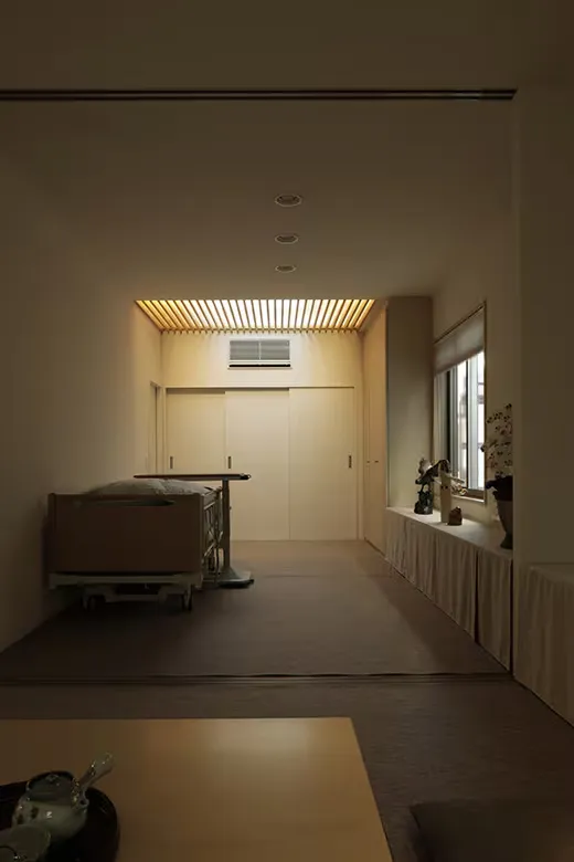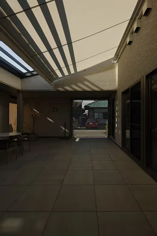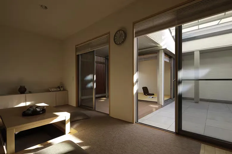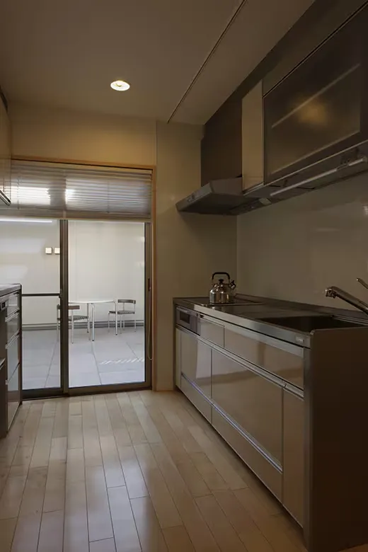 南側の窓から中庭の「間」へつながるキッチン。バーベキューなどをする際の動線も考慮