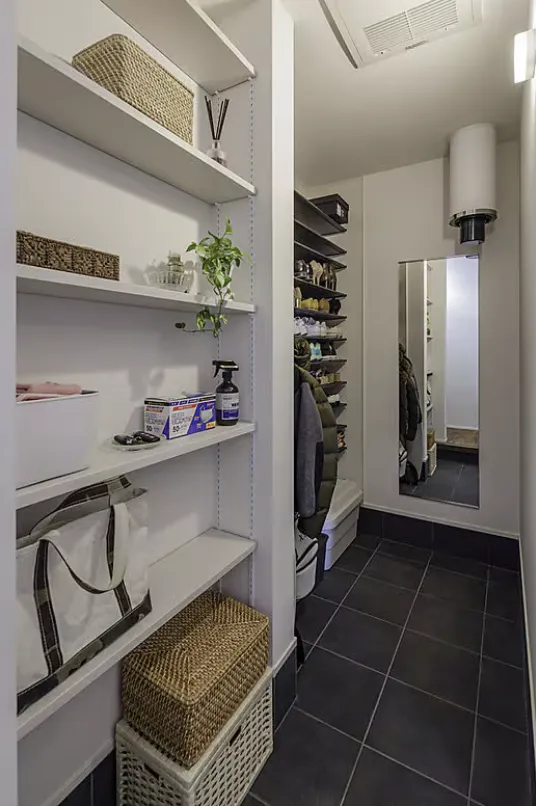 シューズクロークの手前の棚には、マスクのストックや除菌グッズなども収納。