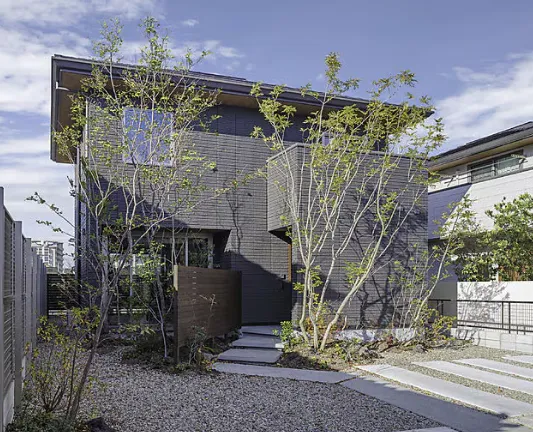 ブラックの外壁に、山から移植した植栽が映える外観。玄関前に壁を立ててプライバシーに配慮。