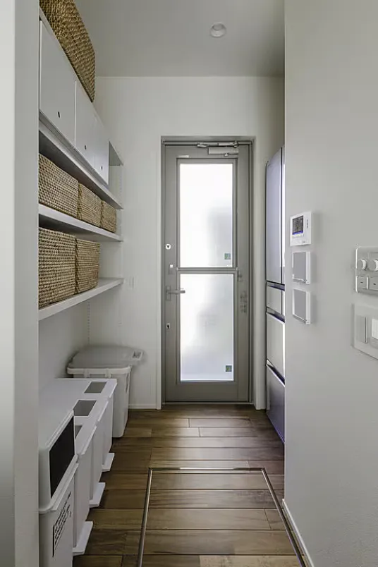 階段下を活かして、冷蔵庫までキッチンクロークへ。勝手口につながっているのでゴミ出しもスムーズ。