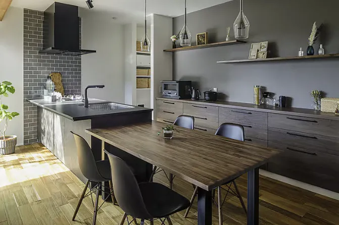 セラミック天板のキッチン、雑貨が飾れるオープン棚など、奥様のこだわりが詰まった空間。