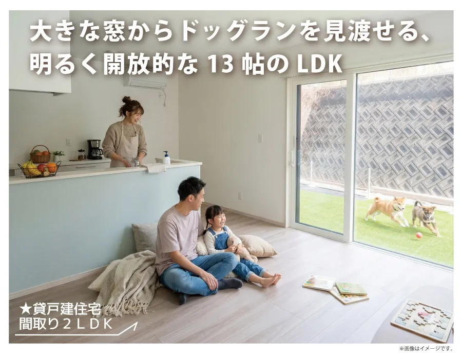 大きな窓からドッグランを見渡せる、明かるく開放的な13帖のLDK