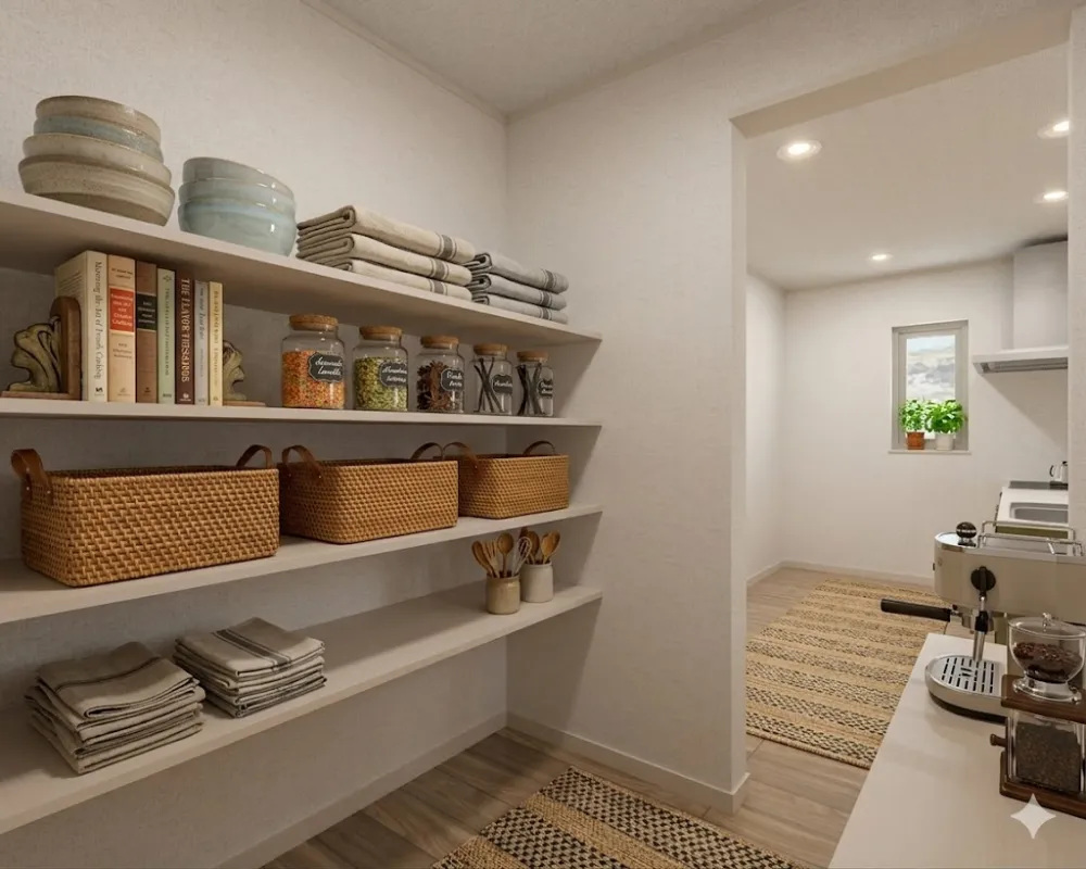 キッチン横にパントリー、その奥に洗面脱衣室と浴室を直線的に配置しました。「洗う・干す・片付ける」や「料理の合間の洗濯」がスムーズに行えるコンパクトな動線は、忙しい毎日の家事負担を大幅に軽減してくれます。